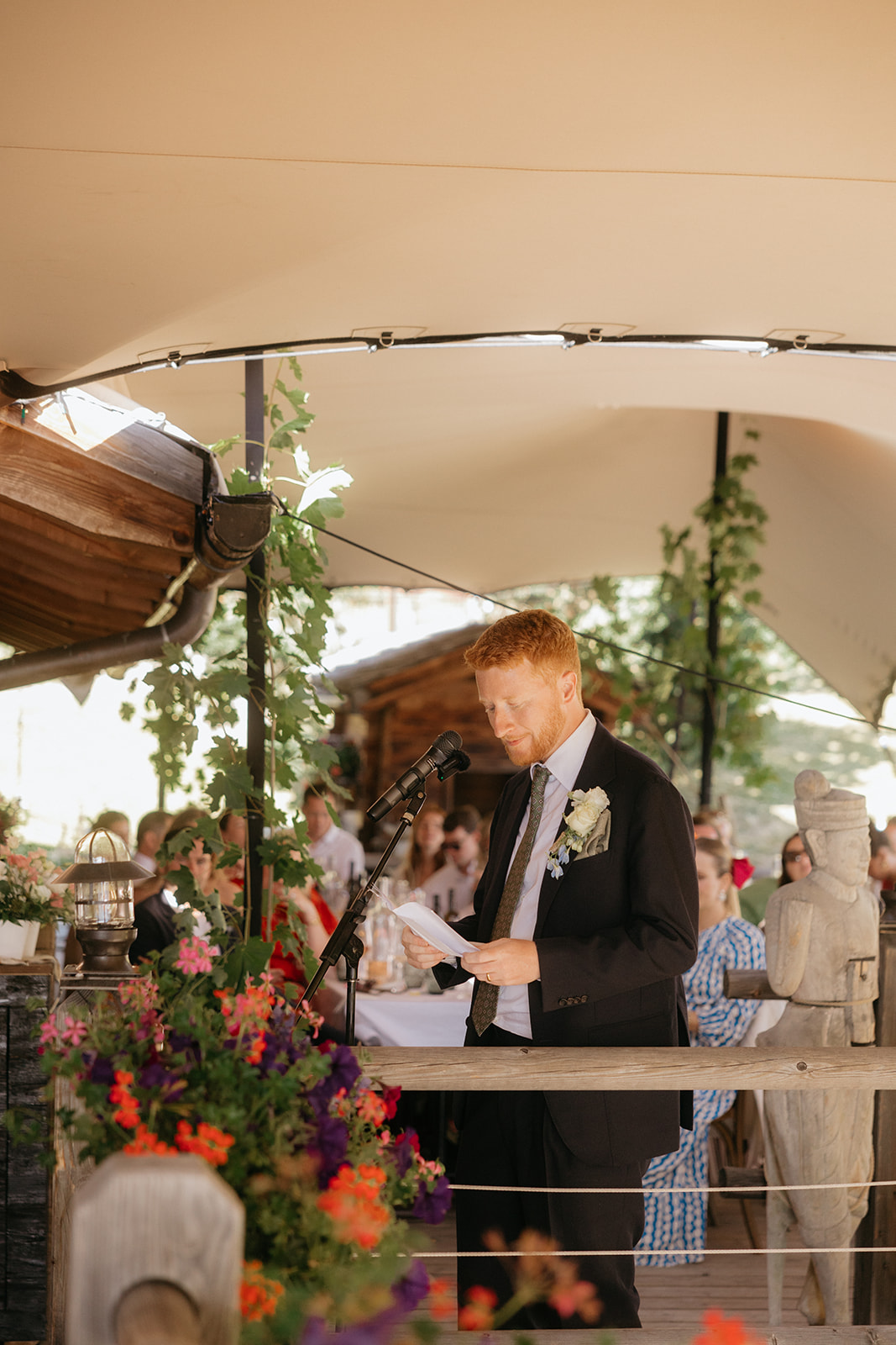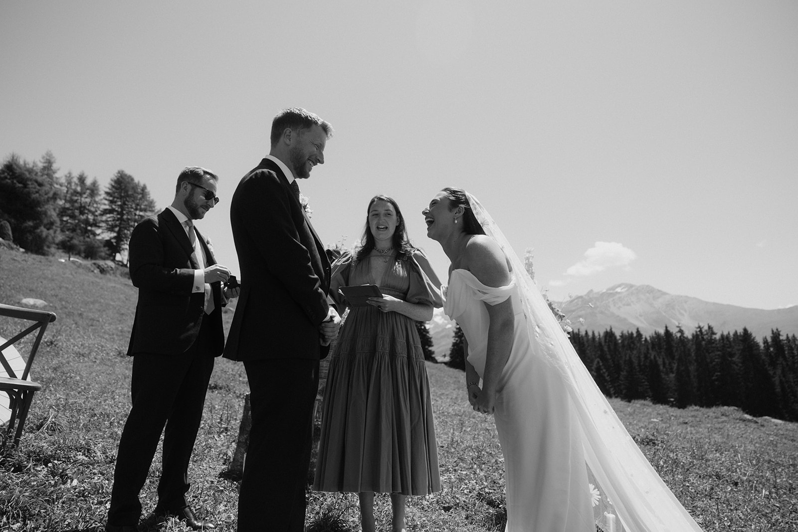 Chez Danny provided the most charming setting for the ceremony — intimate, characterful, and utterly Swiss. With around 80 guests gathered, mostly from the UK, the room was full of warmth and familiarity. And laughter. Lots of laughter. The ceremony had a lighthearted, joke-filled tone that perfectly reflected who Alice and Alex are as a couple. It felt less like a formal event and more like a celebration that had already started.